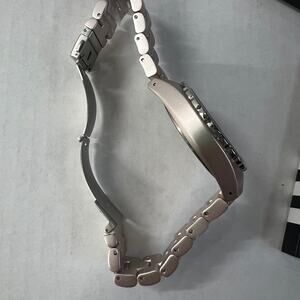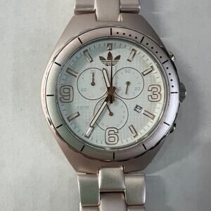 Elegant Adidas watch with a metallic silver finish. Features a white dial and bold numerals.
