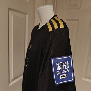 The Mexico Jersey 2025 Black Gold Adidas Seleccion Mexicana Large is a high-quality soccer jersey designed for men. Made of polyester material, this short sleeve jersey features a black color with gold accents, representing the Mexican national team. Manufactured in Mexico, this authentic Adidas jersey is perfect for to support their favorite team in style during FIFA qualifiers and other sporting events. The size L ensures a comfortable fit for fans to wear while cheering on the Mexican football team.