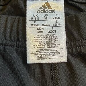 Adidas calf-high athletic pants in black. The pants feature the classic Adidas three-stripe design on both sides and an adjustable drawstring waistband for a secure fit.
