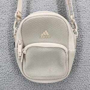 A stylish Adidas mini round crossbody bag, perfect for on-the-go essentials. Featuring a unique beige mesh exterior, this compact bag combines sporty functionality with a trendy Y2K aesthetic. The design includes a main zippered compartment, a front zip pocket for easy access, and an adjustable shoulder strap for comfortable wear. The interior lining is a durable material, ensuring your belongings are secure. Ideal for festivals, travel, or everyday use when you only need the necessities, this Adidas mini backpack adds a touch of sporty chic to any outfit.