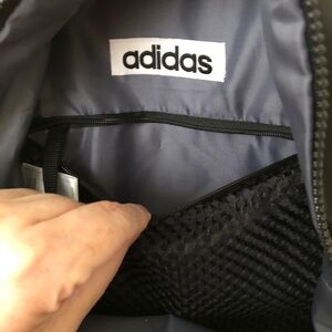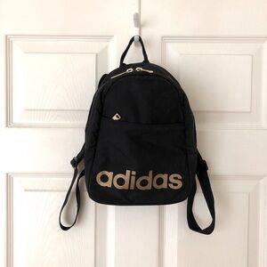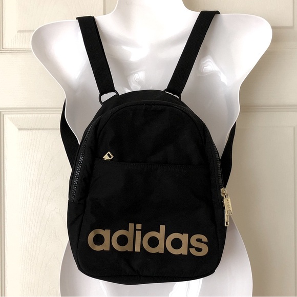 Adidas mini backpack in black with the Adidas logo screen printed in gold and gold zipper pulls. Small exterior zip pocket in front; main compartment has mesh zip pocket and key clip inside. Quilted padded back panel, adjustable straps, woven loop on top for hanging. 100% polyester; hand wash.