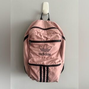 Compact Adidas backpack in metallic pink. Front pocket and adjustable straps.