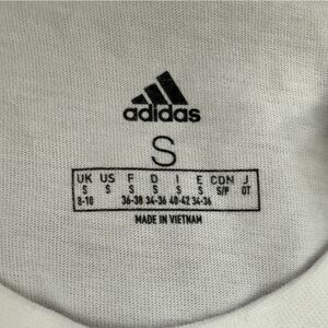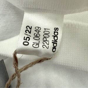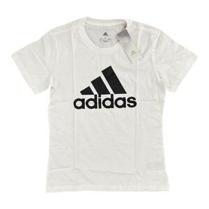 Classic Adidas white t-shirt featuring a bold black logo. Perfect for casual wear.