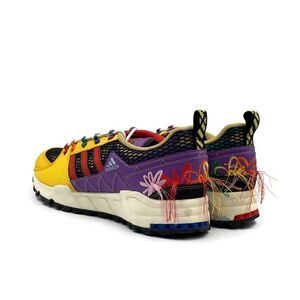 Vibrant Adidas sneakers with a mix of yellow, purple, and red. Unique design with colorful accents. Comfortable and stylish. Worn once!
