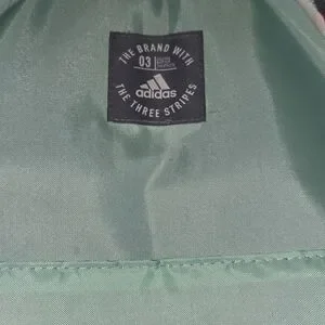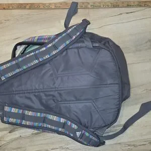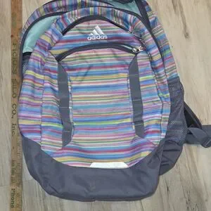 adidas striped backpack in bright multicolor. Features blue, pink, green and yellow horizontal stripes. Padded straps and front zip pocket. Sporty everyday carry.