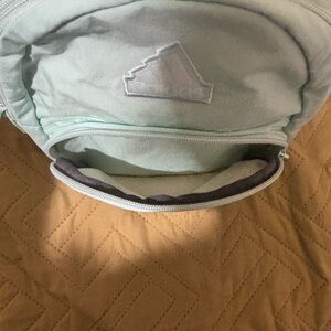 Compact Adidas backpack in sky blue. Features a convenient front pocket.