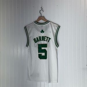 Score big with this vintage Adidas NBA Boston Celtics Kevin Garnett #5 jersey. Crafted from 100% polyester, this authentic NBA jersey showcases classic Celtics green and white, with embroidered team details and Garnett’s name and number prominently displayed. Featuring the iconic cloverleaf on the back and Adidas/NBA Authentics branding for guaranteed quality. Made in Honduras, this size small jersey measures approximately 20” across the chest and 27” from shoulder to hem. Perfect for any basketball fan or vintage sportswear collector!