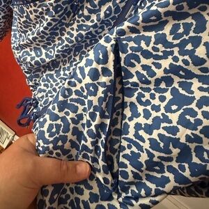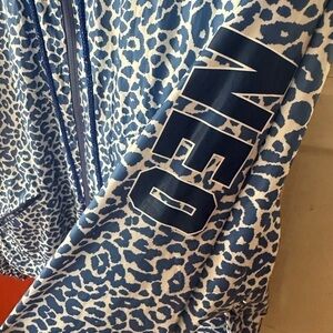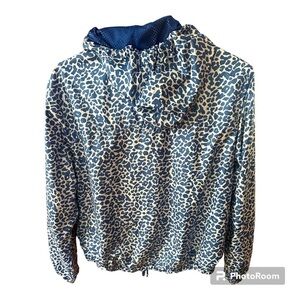 With its blue and white animal print and zipper closure, you can throw this light weight jacket on with any outfit for the perfect finishing touch.