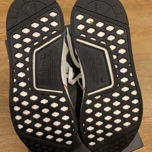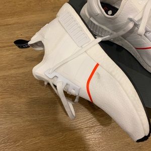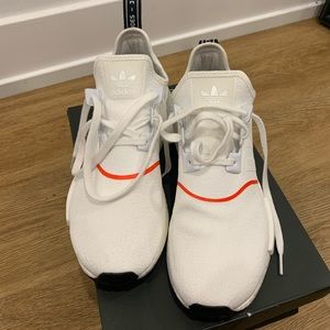 Pair of adidas NMD R1’s for sale. White color way with orange stripe on the front. Wore them once, they’re too big for me.