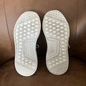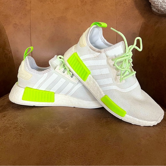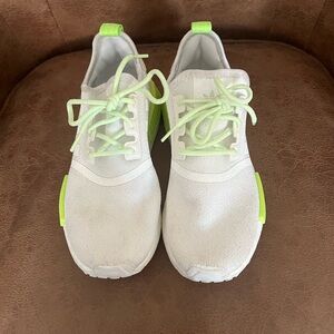 Stylish and comfortable Adidas shoes in white with vibrant neon green accents. Perfect for active play and everyday wear. Could use a good cleaning ,some dark spots that could be cleaned. Unisex size 5.5