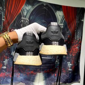 The NMD R1 line is celebrated for fusing heritage running design with superior modern technology. The shoe's core feature is the responsive Boost midsole (appearing off-white/cream), providing exceptional cushioning and energy return for all-day comfort and movement. The multi-toned black mesh upper is lightweight and breathable, ensuring a flexible, sock-like fit, while the iconic three stripes and supportive heel tab are rendered in coordinating black and gray tones. Distinctive design details include the tonal EVA plug inserts embedded in the midsole (one dark gray, one black) and a durable black outsole. With its minimalist colorway and functional design, these Adidas shoes are perfect for runners, sneaker collectors, or anyone seeking a comfortable, high-quality sneaker with a contemporary, sleek aesthetic.
