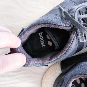 Grey Five Primeknit upper with tonal suede patches on the heel counter and three-stripes branding. A thick boost midsole and molded EVA midsole plug offer response cushioning