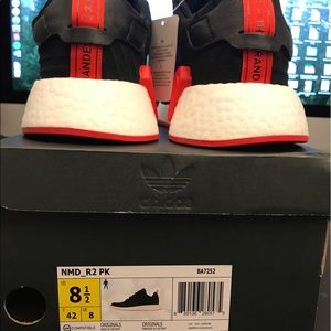 Adidas NMD_R2 Primeknit shoe. Ordered straight through Adidas website during launch day. Just got it delivered on April 13. Get it while it's still fresh and hot! Proof of authentication will be provided upon request for serious buyer only.