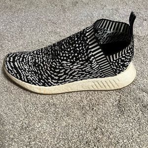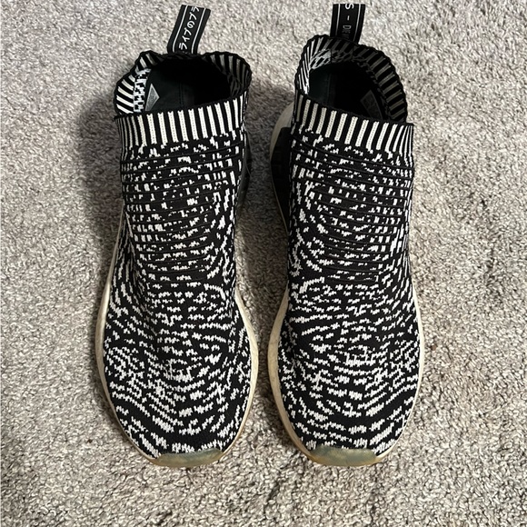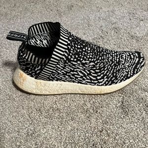 Adidas NMD R2 sneakers in zebra print. They have a few blemishes but imo nothing drastic.