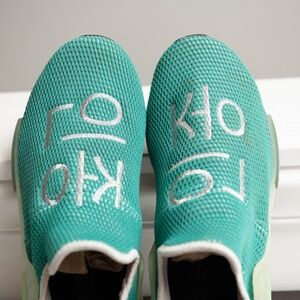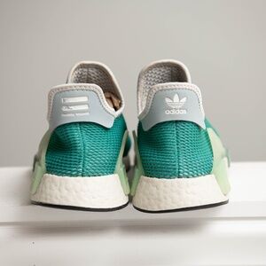 These Adidas NMD X Pharrell Human Race in Dash Green are a Mens Size 10.5 athletic shoes. These shoes are in excellent condition! It looks like these were not even worn, or maybe once! There is no significant wear to the outside of the shoes or tread! These shoes come with the original laces, no box. Dark teal green with silver lettering. Easy slip on and very comfortable!
