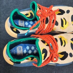 Design: These shoes are a collaboration between Adidas and musician/designer Pharrell Williams, featuring a distinctive leopard print design in shades of amber, black, and bold gold.