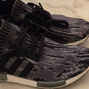 These are the authentic Adidas NMD_R1 Primeknit sneakers in the "Grey Three" colorway. This style is known for its glitch camo print on a Primeknit upper and responsive Boost midsole for cushioning and comfort. The design includes tonal EVA plugs and a rubber outsole.