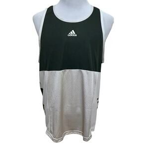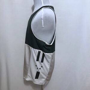 NWT. Green and Cream Jersey for Men Size L. Green top half with cream trim neckline and armholes, and cream bottom hem, breathable, sleeveless, graphic brand logo front top middle, graphic design top back and sides, split hem bottom sides. Pictures are part of description.
