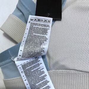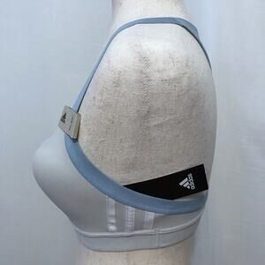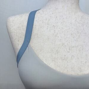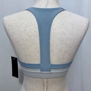 NWT. Pull On T-back Sport Bra Women Size S. Light heather grey (depending on lighting) and blue, brand 3 signature white stripes sides, breathable internal light removable padding. Pictures are part of description.