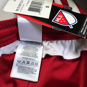 NWT. Red Performance Official License MLS Climalite Shorts for Men Size S. Elastic waist with internal adjustable strap, "Adidas" Logo back bottom left, and Adidas famous 3 stripes sides. Pictures are part of description.