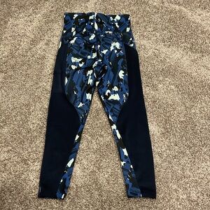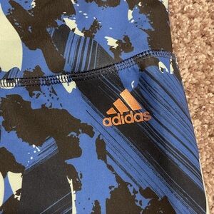 Dynamic navy and black leggings with a bold pattern. Ideal for active wear. They are made by Adidas and are a size m. They are in very good condition and have an inseam of 29 inches. There is a pocket on the side of one of the legs.