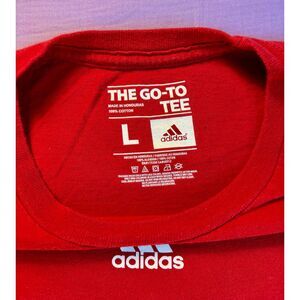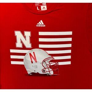 Red Adidas Go-To Tee with Nebraska Cornhuskers football helmet logo with Nebraska-ized flag background. Clean and soft - excellent pre-owned condition. Nice pickup for Husker faithful.