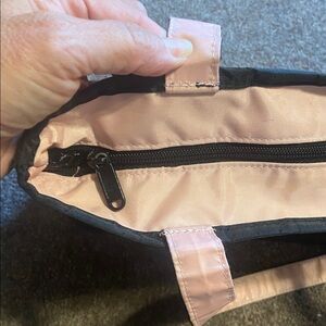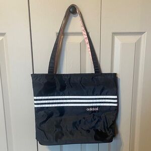 For sale is this Adidas tote bag. This bag is made of nylon and is black in color with white stripes. The adidas name is in light pink, and it has a pink and black interior lining. The straps are black on one side and pink on the underside.