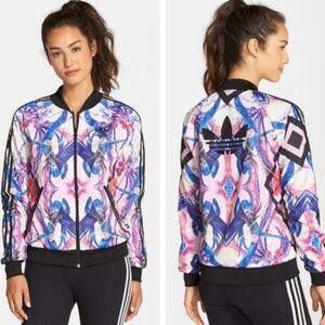 The iconic zip-front track jacket from adidas is updated in a vibrant kaleidoscope bird print that perfectly contrasts the ultra-sporty styling. Classic 3-stripe sleeve trim with embroidered trefoil branding at the chest and back. two front zipper pockets. Lined interior.