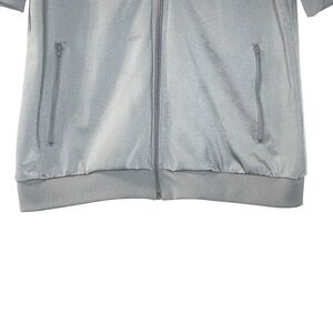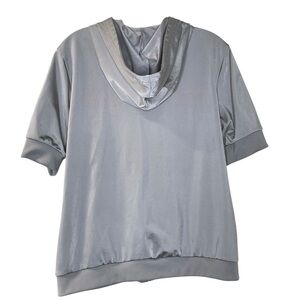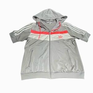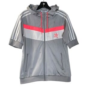 Adidas short sleeve hoodie in gray with vibrant pink details. Features signature stripes and logo. Adidas 3/4 sleeve zip up jacket.
