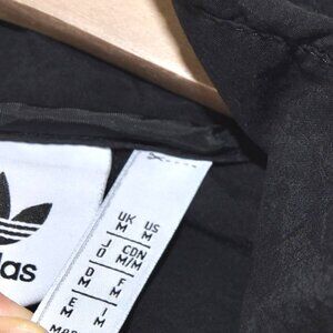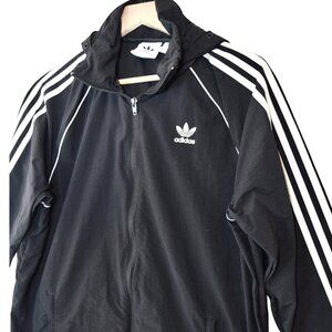 This Adidas Originals jacket delivers the iconic Trefoil and 3-Stripes design in a versatile black colorway. Featuring a full zip front, drawstring hood (missing cord but still functional), and lightweight nylon construction, it’s perfect for layering in transitional weather. Classic Adidas style with sporty streetwear appeal. Size Medium.