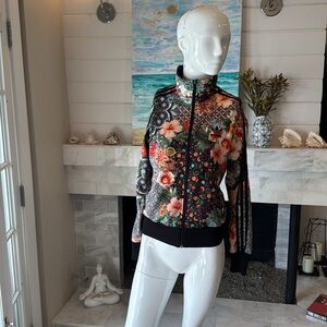 Black muti floral track jacket with the Adidas logo & stripes plus a stand up collar, front zipper closure and zippered pockets