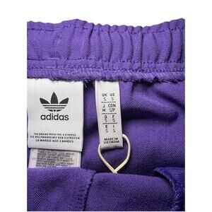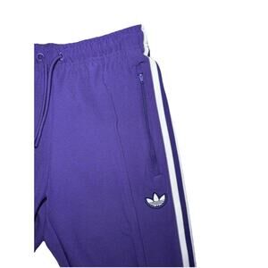 The Adidas Originals Real Madrid Terrace Icons Track Pants in men's size small are a stylish and comfortable choice for active wear. Made from polyester/spandex knit fabric, these purple pants feature a tapered and cuffed leg style with an elastic waist for a secure fit. With drawstring closure and convenient pockets, these pants are perfect for soccer and other activities. Machine washable and featuring the iconic Adidas Originals product line, these track pants offer both style and functionality for any season.