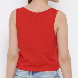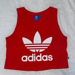 Red cropped tank top with white Adidas logo