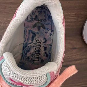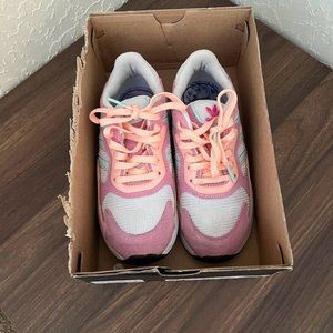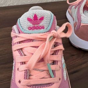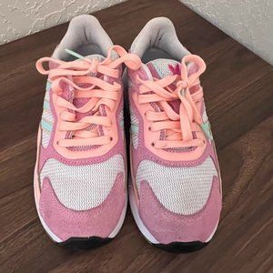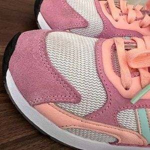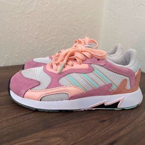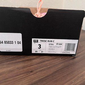EUC Adidas Originals Tresc Run C Kids' Running Shoes. Inspired by running shoes from the 90s, these juniors' shoes combine vintage technical style and modern cushioning. They feature a layered upper with reflective 3-Stripes. A Boost midsole gives responsible comfort. Finished with a flame-shaped midsole plug and a multicolored rubber outsole. Low-top lace-up. Pink, mint, and white. Size US 3, F 35, UK 2 1/2. Comes with damaged bottom part of box only. Excellent used condition. Only worn maybe once.