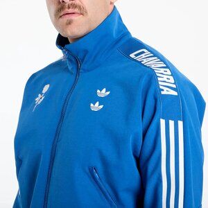 The Willy Chavarria Adidas Track Jacket is elevated in a ponte knit fabric to provide exceptional quality and comfort. The track jacket is designed with smaller proportions in the body and sleeves. Functional details include a ribbed collar and side pockets with zippers on each side of the body. Branding is symbolized by embroidered double trefoils on the wearer's left chest and embroidered roses on the wearer's right chest, and embroidered Chavarria logo on the left chest. 3 stripes tape with Chavarria incorporated in it runs down each sleeve in segments.