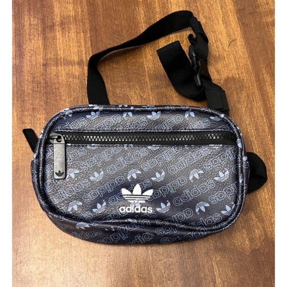 Adidas PU Faux Leather Waist Pack- Navy Blue. Inspired by the boxy shape of vintage Adidas airliner bags, this handy pack stashes your essentials in Trefoil style. Faux leather. A zip pocket in front keeps your phone or keys within easy reach. The adjustable webbing strap lets you wear it across your body or around the waist. Approximately 8" X 5" X 2.5". 100% polyurethane. Excellent used condition.