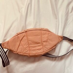 Stylish Adidas waist bag in peach. Features a convenient zip pocket and adjustable strap.
