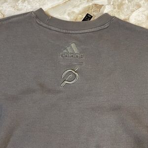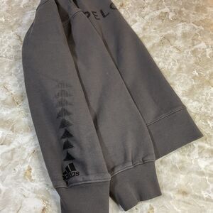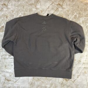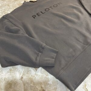 Stylish Adidas x Peloton collaboration gray sweatshirt in unisex size Large. Features Peloton text across the front, Adidas logo on the sleeve and back, and a modern tonal Peloton emblem on the upper back. Ribbed crewneck, cuffs, and hem for a snug fit.
