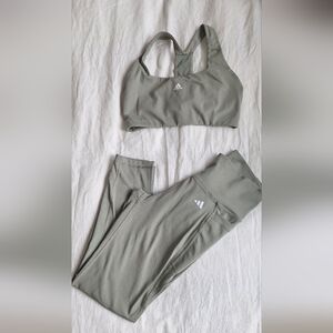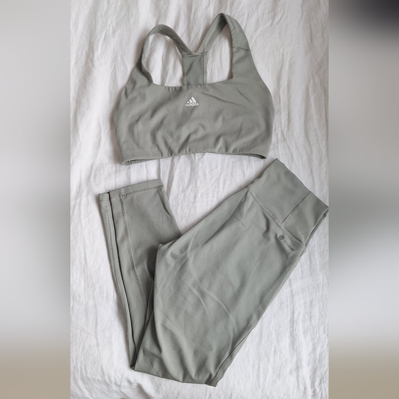 Light green performance set from Adidas. Fits true to size. Buttery soft! Has a side pocket on one leg!