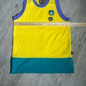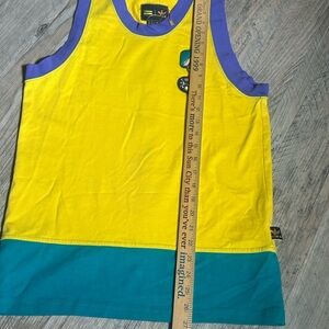 Adidas Pharrell Hike Tank, featuring vibrant yellow, purple, and teal colors. Perfect for sunny days and a great hike