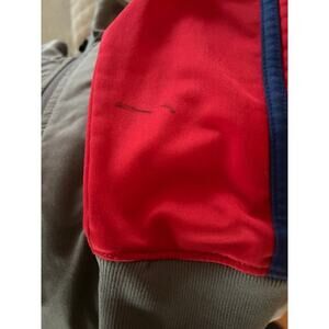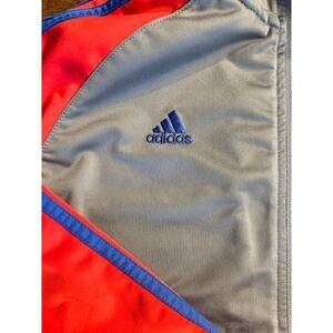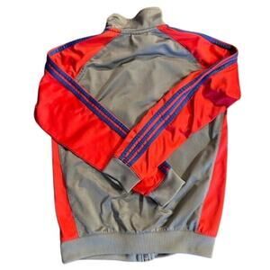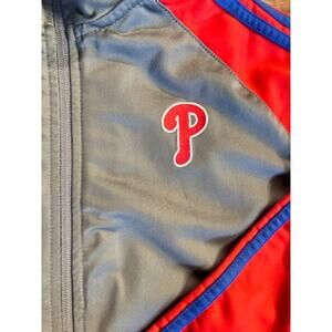 Adidas Philadelphia Phillies youth track jacket in size Medium (10/12). Features gray body with red and royal blue accents, embroidered Adidas and “P” Phillies logos, ribbed cuffs/hem, and full zip front. Lightweight and sporty, great for fans or practice layers.