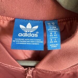 Stylish pink bomber jacket by Adidas. Features a zip-up front and side pockets.