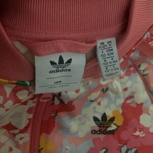 Bright floral design with Adidas logo. Pink base with colorful flowers.