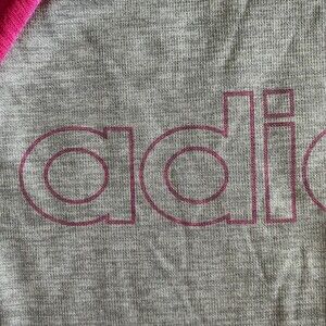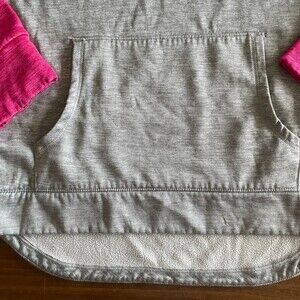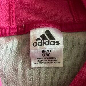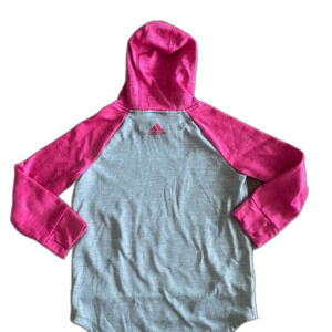Adidas hoodie, girls’ S (7/8), 100% polyester. Pullover style, kangaroo pocket, high-low hem with straight front hem & curved back hem, thumb hole wristbands, fleece interior, gray body with pink sleeves & hoodie, brand across chest in pink, 3 satin stripes on hood, no stains or snags.