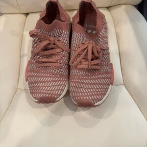 Stylish Adidas NMD R1 sneakers in a pink and white knit design. Features a comfortable sole and signature branding. These have only been used a couple of times and are in almost new condition!