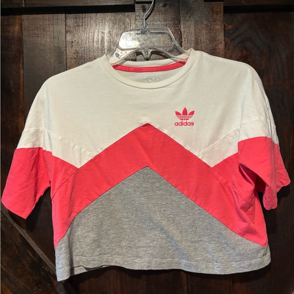 This Adidas tee showcases a vibrant pink and white colorblock design, perfect for adding a pop of color to your wardrobe. With its short sleeves and classic crew neckline, it offers a comfortable fit for any casual occasion. The iconic Adidas trefoil logo adds a touch of sporty flair to this stylish top.