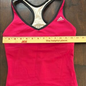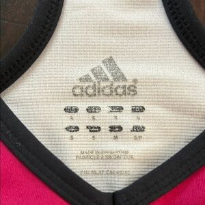 Experience ultimate comfort and style with the Adidas Pink Tank Top, perfect for your workout sessions. This form-fitting tank features a racerback design, crafted from a stretchy athletic material for optimal movement. Its vibrant pink hue adds a pop of color to your activewear collection.