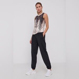 Made with parley ocean plastic. Sleeveless exercise tank top, athletic, gym, working out, running, abstract design in black, cream, and pink