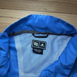 This Adidas Pullover in Men's XL is a blue quarter zip short sleeve golf windshirt made of polyester with a solid pattern. The mid-length jacket features a zip closure, lined interior, lightweight design, ventilation, and breathability, making it ideal for activewear and casual occasions. With its sporty theme and performance-focused features, this windbreaker is perfect for golfing and outdoor activities. The adidas brand ensures quality and style for the modern man looking for a comfortable and functional outerwear option.