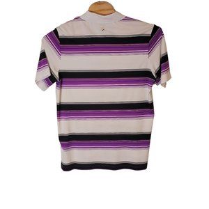 This Adidas Pure Motion Golf Polo Shirt is a size large. It features a white, purple, and blue striped design with short sleeves, perfect for adding style to your golf games.